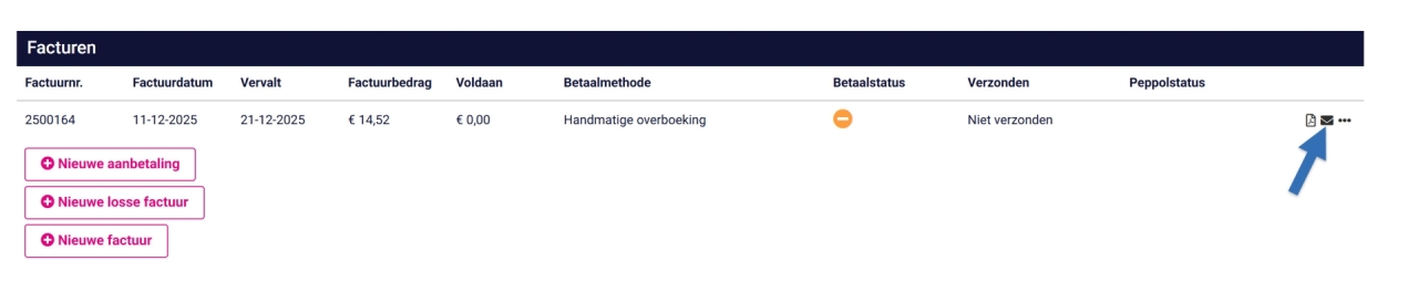 - Klik op het envelop icoon om de factuur naar je relatie te versturen.