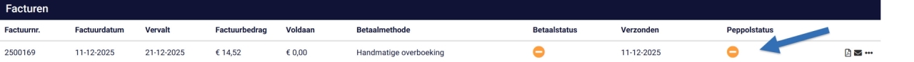 - Je ziet daarna een Peppol status die aangeeft of de verzending is gelukt en of de factuur correct is ontvangen door het Peppol accesspoint van de klant.