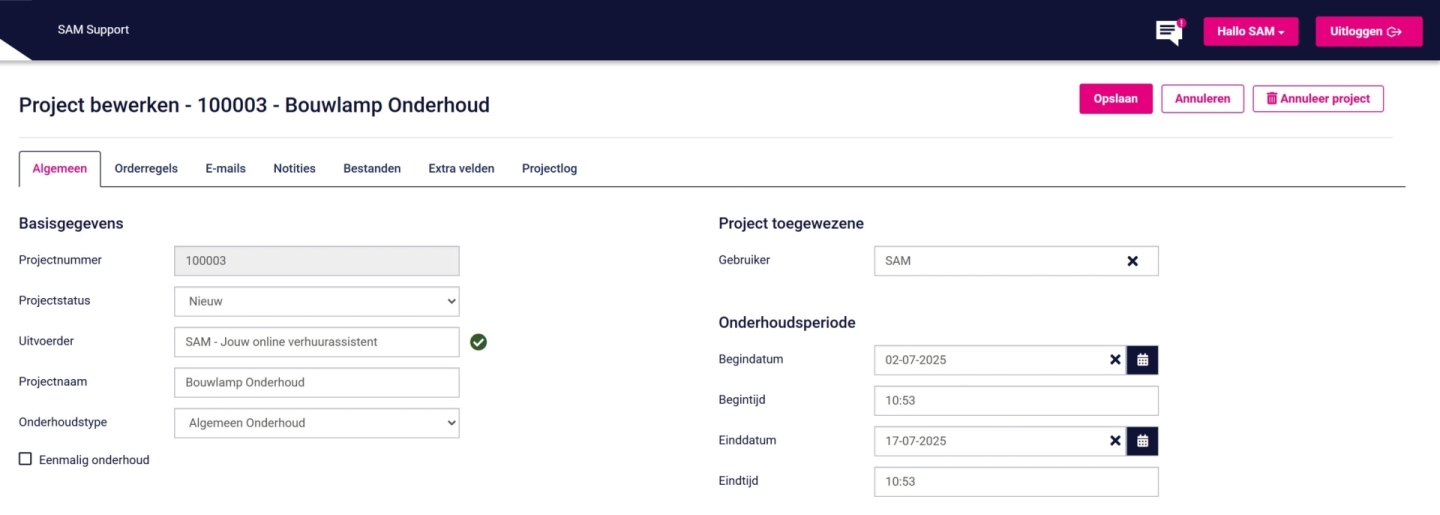 In deze tab bewerk je de basisgegevens in van het onderhoudsproject.