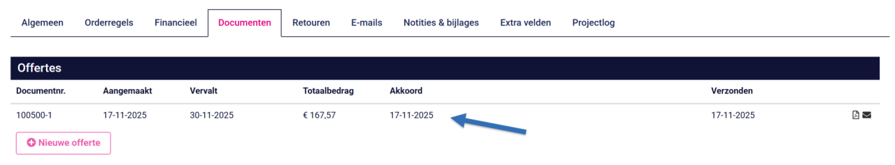 Wanneer een klant in de verzonden e-mail op de knop “Bevestig offerte” klikt, wordt de akkoorddatum automatisch ingevuld. Deze datum verschijnt ook als filter in het projectoverzicht. Zo kun je snel zien welke offerte als eerste is bevestigd en dus welke projecten als eerste in aanmerking komen voor uitlevering.